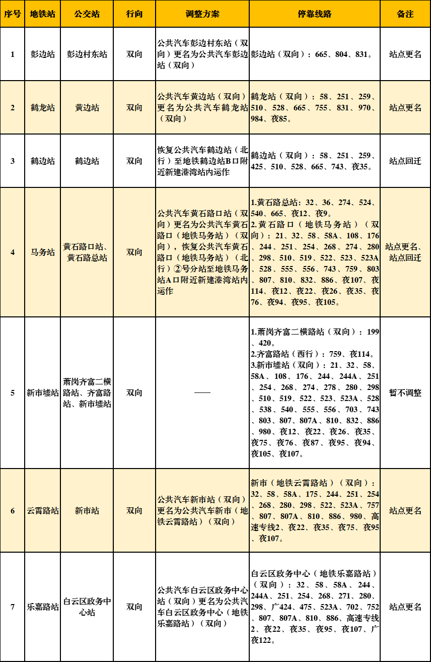 公共汽车白云区政务中心站(双向)更名为公共汽车白云区政务中心(地铁乐嘉路站)(双向),公共汽车32、58、58A、244、244A、251、254、268、271、280、298、广424、475、523A、702、752、807、807A、810、886、高速专线2、夜22、夜35、夜95、夜107、广夜122。